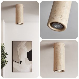 Đèn ốp trần phong cách Wabi Sabi. Chất liệu đá Cream Cavity và gỗ Black Walnut. Kích thước T65*H160mm