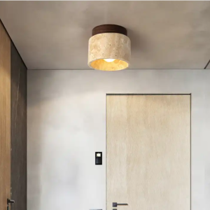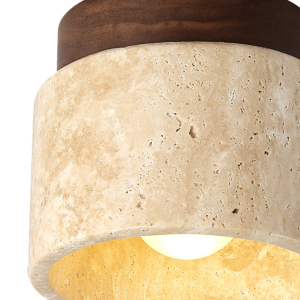 Đèn ốp trần phong cách Wabi Sabi. Chất liệu đá Cream Cavity và gỗ Black Walnut. Kích thước ø120*H100mm